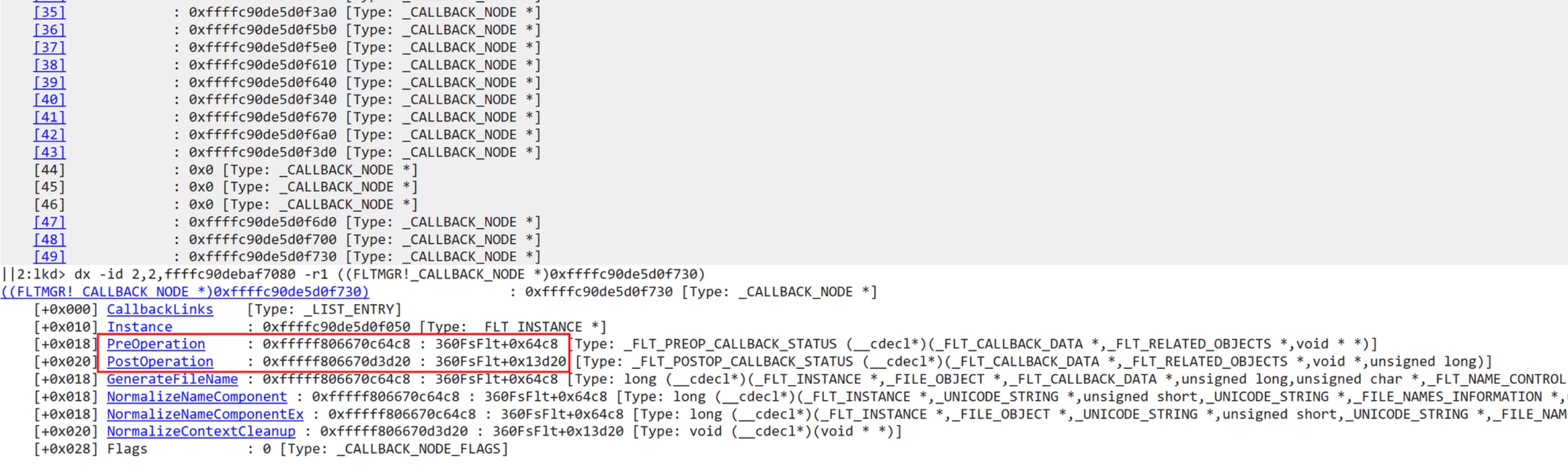 每个数组保存了一个_CALLBACK_NODE 结构的双向链表(这个结构中的地址和FLT_INTANCE 的callbacknodes 数组中保存的地址相同),我们需要遍历并清除这个链表中的包含EDR 回调的_CALLBACK_NODE 结构。