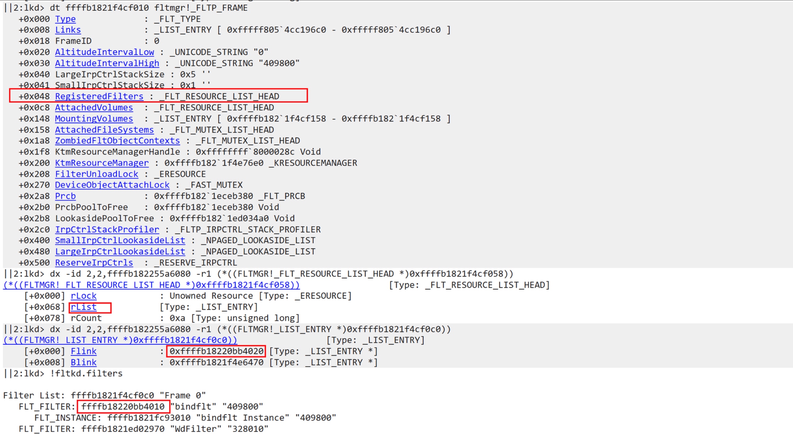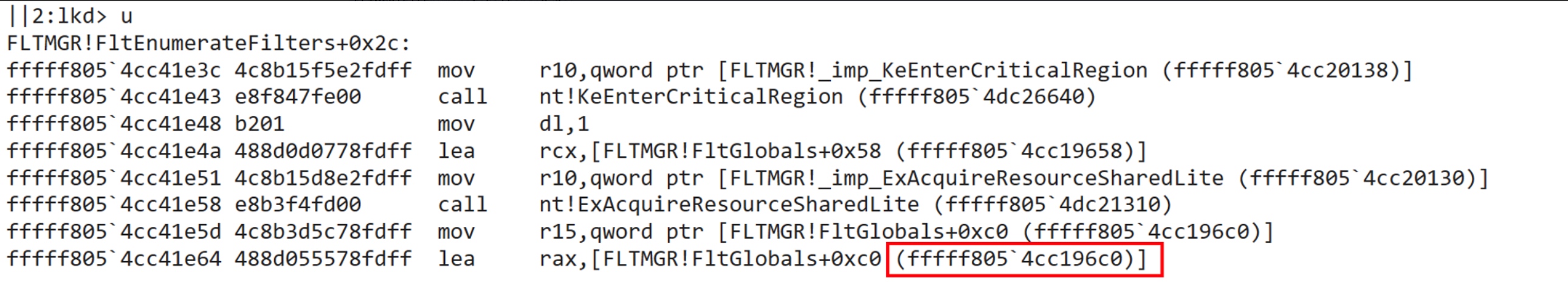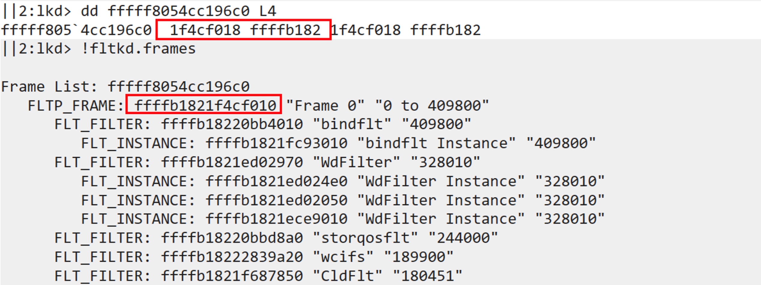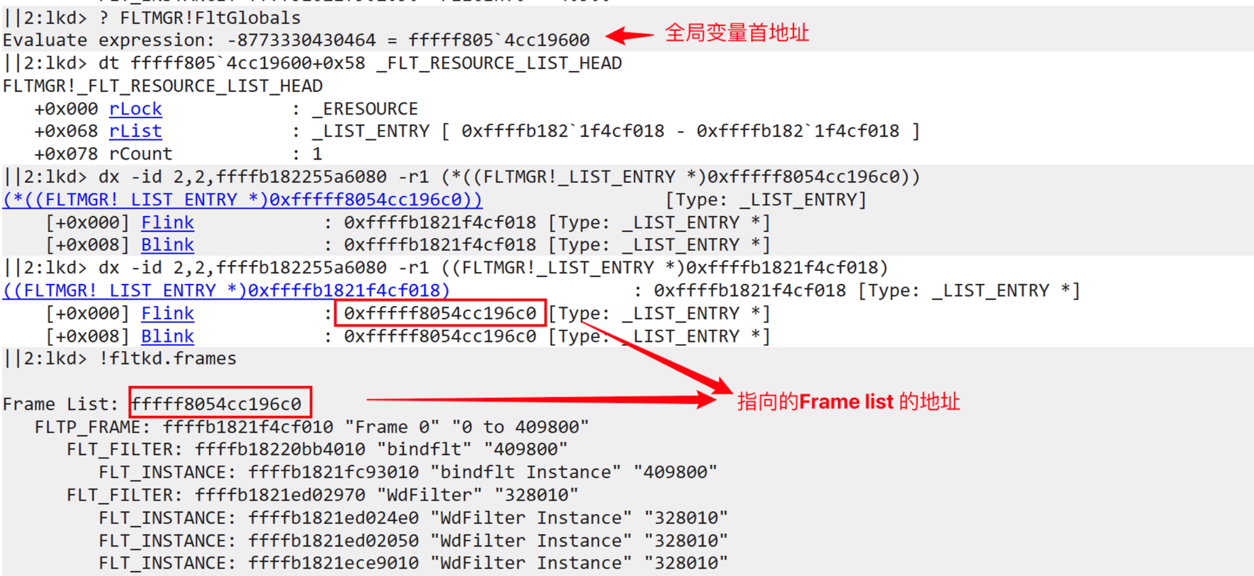 分析发现FltEnumerateFilters 这个FLTMGR.sys 导出函数中就有指向Frame 的地址,如下图: