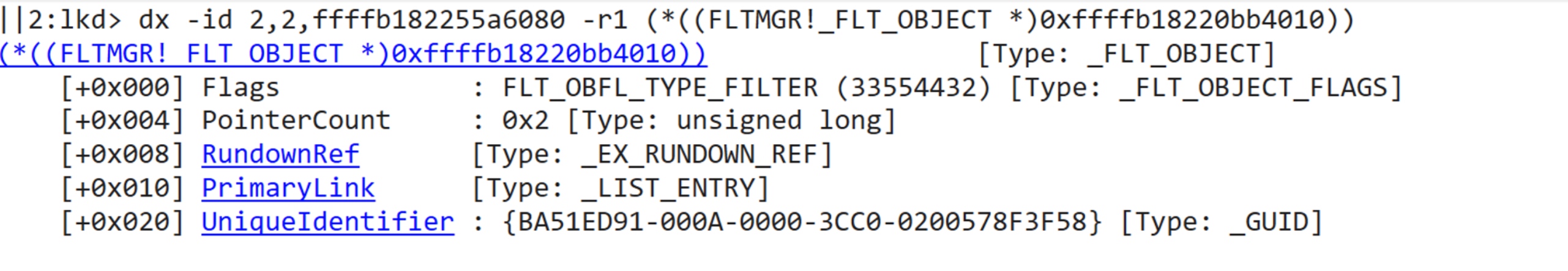 发现Flink 指向的地址减去0x10 就是_FLT_FILTER 的地址。Flink 默认指向的是_FLT_FILTER的PrimaryLink 字段,如下图:
