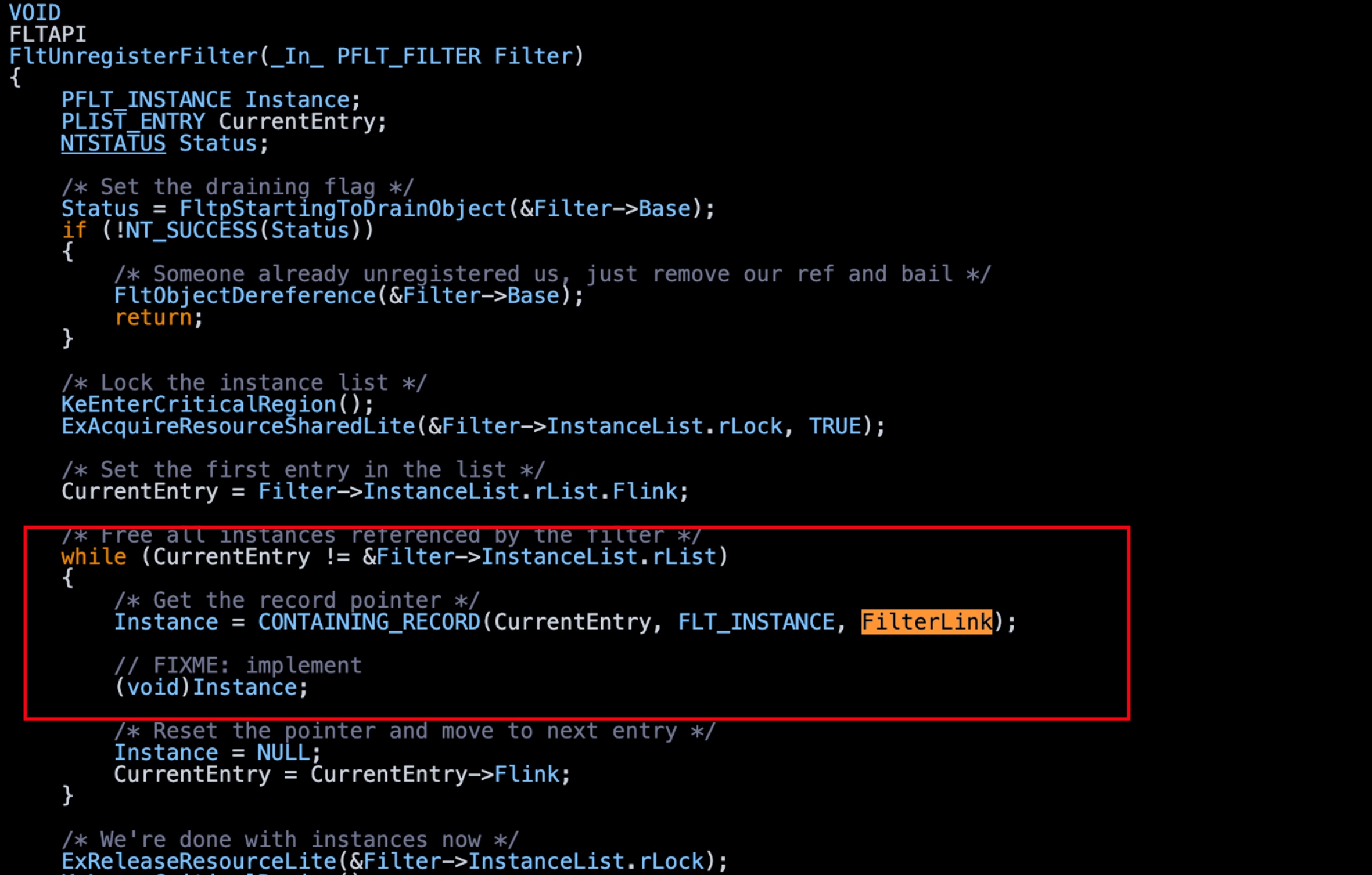 网上查了一下,ReactOS 上的FltUnregisterFilter() 函数处理逻辑给出了答案:(其实和上面PrimaryLink 是一种原因)
