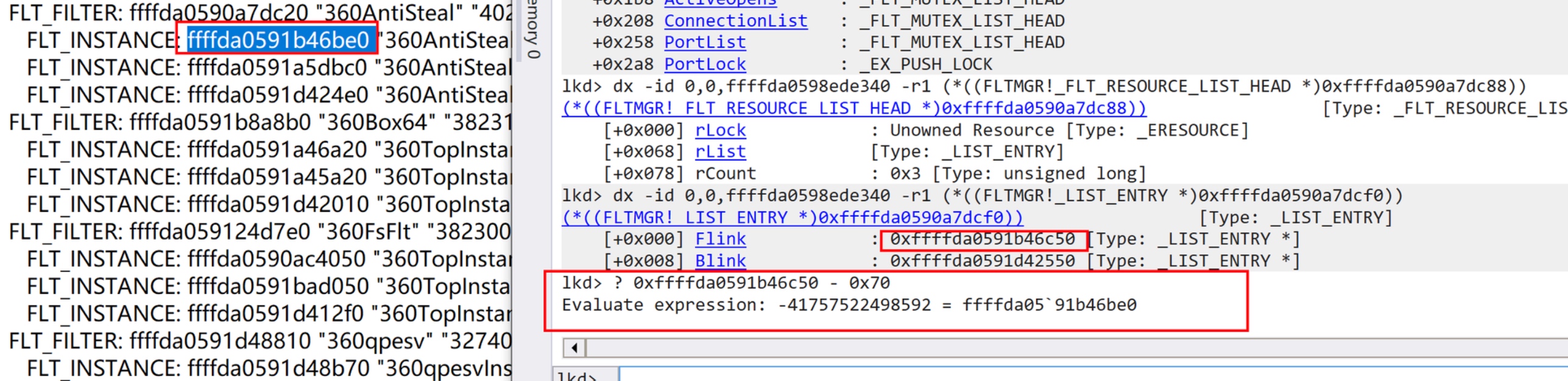 _LIST_ENTRY 中的地址还需要通过CONTAINING_RECORD(CurrentEntry, FLT_INSTANCE, FilterLink); 减去FLT_INSTANCE 结构的FilterLink 偏移地址。这下刚好对应了,如下图: