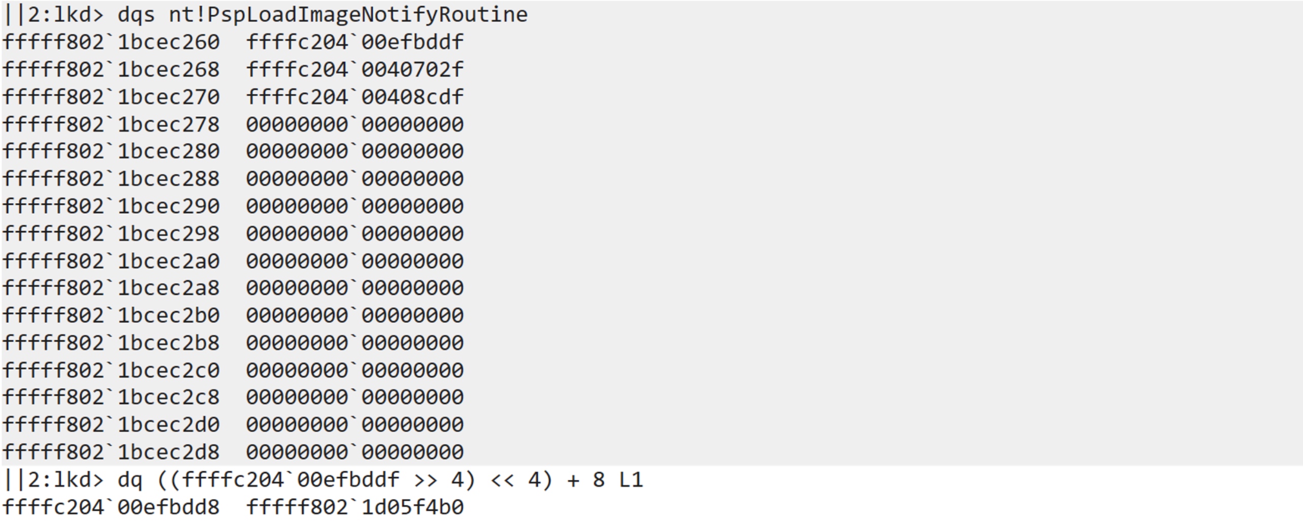 Image 通知回调函数地址是通过回调注册函数PsSetLoadImageNotifyRoutine() 中定位PspLoadImageNotifyRoutine 数组来获取的。